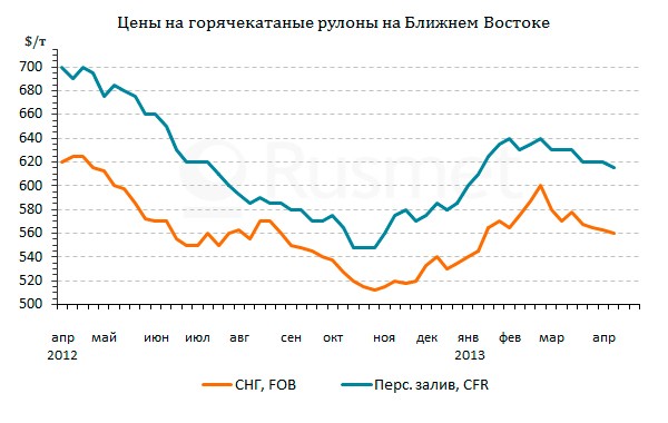 При поставках в другие страны Ближнего Востока российские горячекатаные рулоны могут достигать $575-580 за т FOB, но спрос на эту продукцию ограниченный. Покупатели продолжают выжидать в расчете на новые скидки. В Персидском заливе, например, резко сбавили котировки китайские компании, предлагающие горячекатаные рулоны на уровне $595-615 за т CFR – дешевле, чем стоит продукция из Ирана или стран СНГ. Индийские производители продают свой горячий прокат в страны Залива по $610-635 за т CFR, а предложения со стороны японских и корейских компаний, поступающие на уровне $640-660 за т CFR, отвергаются.