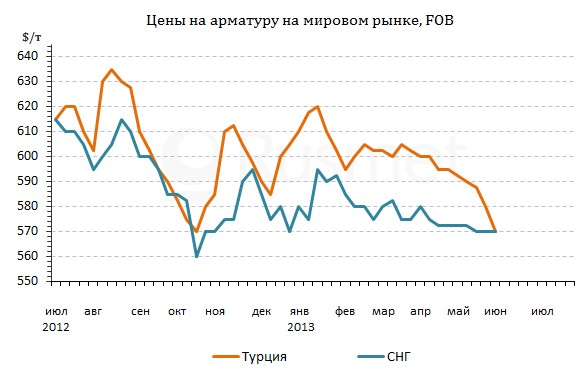 Турецкие компании могут сейчас рассчитывать, в основном, только на внутренний рынок, где спрос на конструкционную сталь действительно оживился. Из-за снижения курса турецкой лиры по отношению к доллару (более чем на 4,5% за последние две декады) внутренние котировки на арматуру в Турцию не превышают $575-590 за т EXW. Однако это все-таки лучше, чем при экспорте, где к началу июня стоимость продукции опустилась до $565-575 за т FOB.