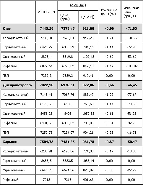 С 23 по 30 августа 2013 г. прайсовые цены на листовой прокат в Украине понизились. Об этом свидетельствуют данные index.ugmk.info. В частности, по Киевскому региону индекс понизился на 0,96% или на 71,83 грн./. В частности, понижение было вызвано изменениями прайсов компании "Викант" (Киев).